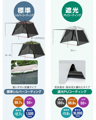 ※[店舗管理用 URL]a09178※[品番]【ダークブラウン/本体のみ:a13471】【ダークブラウン/シート1枚付き(+1,100円):a13848】【ダークブラウン/シート2枚付き(+2,200円):a13849】【カーキ/本体のみ:a13472】【カーキ/シート1枚付き(+1,100円):a13850】【カーキ/シート2枚付き(+2,200円):a13851】 ゆったり広々サイズで快適空間 285cmサイズのメッシュスクリーンテント 285cm×285cmサイズのスクリーンテントです。