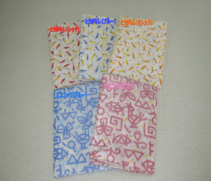 適応サイズ 【サイズ】 丈(長さ):93cm、巾(横):80cm 製造 日本製 素材 ・ポリエステル100% カラー とうがらし(レッド)、とうがらし(ブルー)、とうがらし(オレンジ)エスニック(ピンク)、エスニック(ブルー) 注意 ●洗濯はすすぎを十分に。