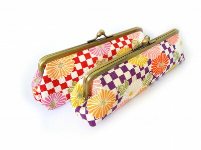 がま口 三角ペンケース【新菊市松・赤】和柄 古典柄 花柄 鎌倉てづくり屋