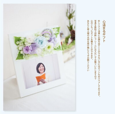 ギフト対応フォトサービス(無料)、ラッピング(無料)、手提げバッグ(無料)、メッセージカード(無料)、あす楽(午前中までのご注文確定)、配達日時指定、コンビニ&郵便受取ご用途季節お正月 正月 成人式 成人の日 愛妻の日 バレンタインデー フラワーバレンタイン ホワイトデー 合格祝い ひな祭り 桃の節句 卒業祝い 卒業式 卒園祝い 卒園式 イースター 入学祝い 入学式 入園祝い 入園式 母の日 母の日プレゼント父の日 父の日ギフト 暑中見舞い 御中元 お中元 サマーギフト お盆 お彼岸 秋の花贈り 敬老の日 敬老の日ギフト ハロウィン 七五三 いい夫婦の日 ウィンターギフト クリスマス Xmas クリスマスプレゼント クリスマスギフト祝事日常の贈り物結婚祝い 結婚記念日 結婚式 記念日 お祝い 御祝い 内祝い 金婚式 銀婚式 真珠婚式 珊瑚婚式 結婚内祝い 新築祝い 新築内祝い 誕生日 誕生日プレゼント バースデー バースディ 出産祝い 出産内祝い 七五三祝い 七五三内祝い 快気祝い 快気内祝い 退院祝い 引越し祝い 1か月記念 6か月記念 半年記念 1年記念 発表会 コンサート リサイタル 個展 お祝い返し 贈り物 楽屋花 お見舞い お礼 フラワーギフト長寿のお祝い還暦(数えで61歳のお祝い) 古希(数えで70歳のお祝い) 喜寿(数えで77歳のお祝い) 傘寿(数えで80歳のお祝い)米寿(数えで88歳のお祝い) 卒寿(数えで90歳のお祝い) 白寿(数えで99歳のお祝い) 百寿(数えで100歳のお祝い)お供えお供え お悔やみ 御仏前 御霊前 お供えギフト お供え物 四十九日法要 法事 初七日 仏花 お供え花 命日 月命日 一周忌 喪中見舞い ご供養 ペット供養ビジネス開店祝い 開業祝い 周年記念 昇格祝い 就任祝い 昇進祝い 新社屋 事務所移転 昇進 転勤 定年退職 退職祝い 離任式 送別会 就任式 贈答品 歓迎会 歓送迎会 記念品 開院祝い 受付 オープン記念贈り相手お父さん お母さん 父 母 おじいちゃん おばあちゃん祖父 祖母 妻 夫 男性 女性 彼氏 彼女 恋人 家族 両親 新郎 新婦 孫 女の子 男の子 友人 友達 女友達 男友達 上司 同僚 恩師 先輩 後輩 取引先 先生 担任 義父 義母 10代 20代 30代 40代 50代 60代 70代 80代 90代プリザーブドフラワー 仏花 写真立て 『花想い−お供えフォトフレーム−』 【プリザーブドフラワー お供え 写真立て フォトフレーム ペット お悔やみ 仏花 プリザードフラワー 写真プリントサービス 贈り物】 「花想」はあなたが故人様を大切に想う気持ちを花で形にしたフォトフレームです 大切な方のお写真を枯れない花プリザーブドフラワーとともに飾れば 優しい思い出がいつまでも鮮やかに輝き続けます。