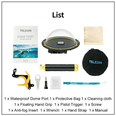 【商品仕様】・素材:PC(ポリカーボネート) + Plexiglass(プレキシガラス)・水中で防水レベル:30m【商品内容】・ドームポート x 1個・フローティングハンドグリップ x 1個・ネジ x 1個・レンチ x 1個・クリーニングクロス x 1個・ドーム保護バッグ x 1個・シャッタートリガー x 1個・曇り止めインサート x 6個【注意事項】※説明書は付属しません。